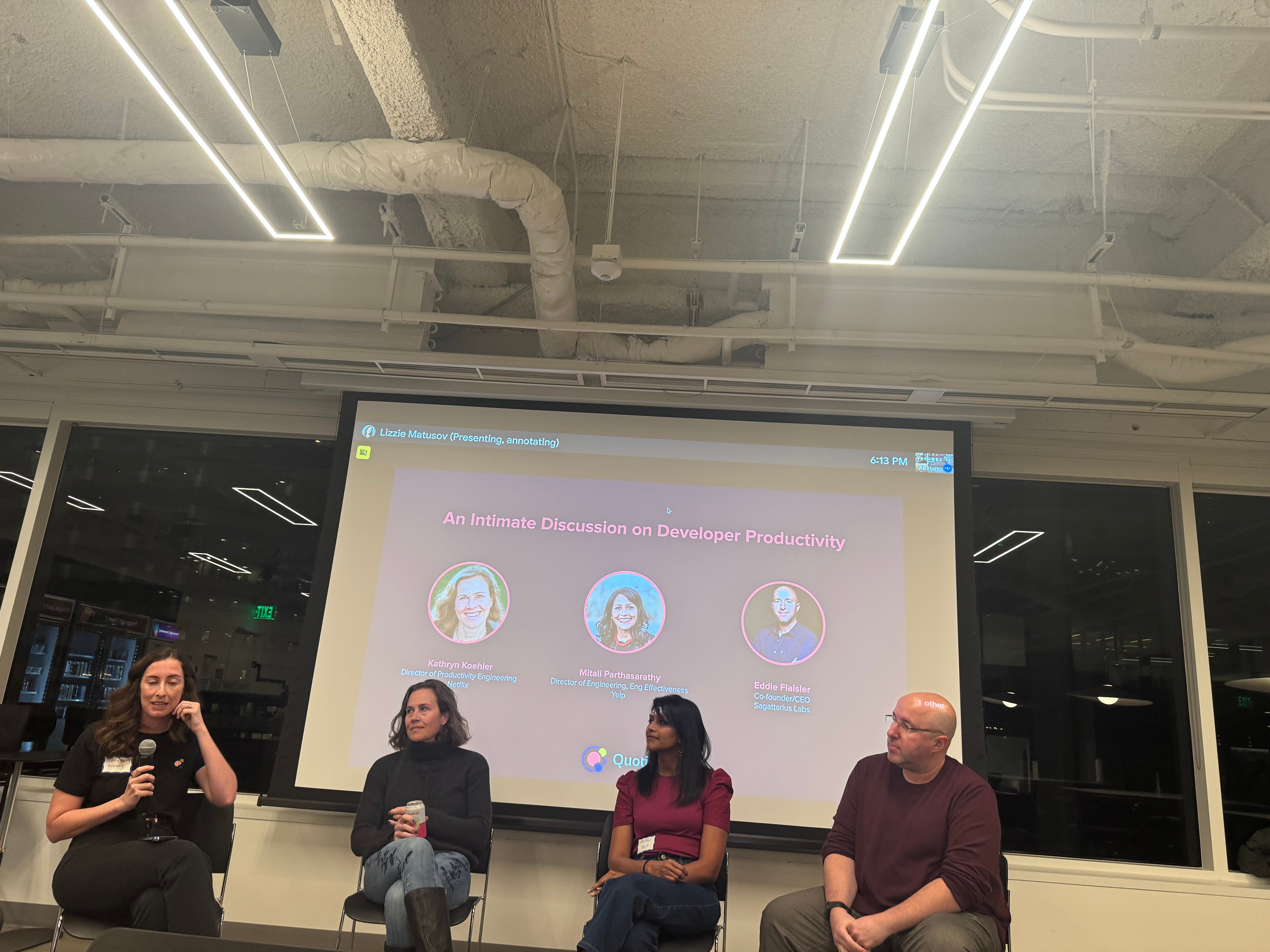 I also was invited to attend a panel on developer productivity with Kathryn Koehler, Director of Productivity Engineering at Netflix Mitali Parthasarathy, Director of Engineering (Engineering Effectiveness) at Yelp Eddie Flaisler, CEO at Sagittarius Labs, prev. VP of Engineering at Lob.