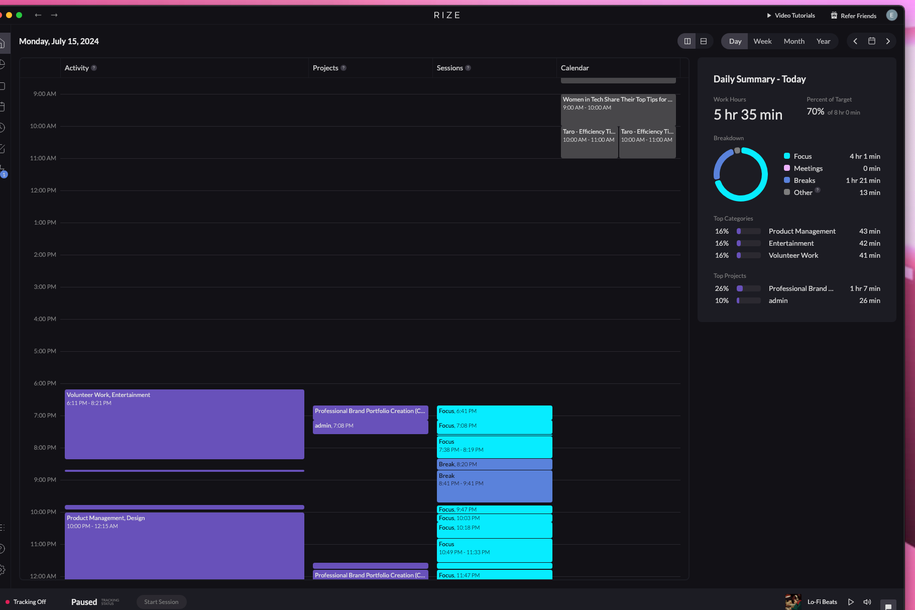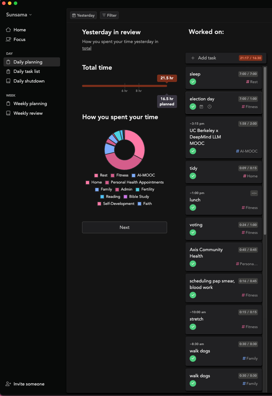 Sunsama (YC W19) Like Rize, Sunsama has a cool data visualization, though not as dynamic as Rize, it still gives summaries (emails you) daily giving you a progress report whether or not you have completed your shutdown ritual of the day. The founder of Sunsama and their staff is super responsive and approachable over email about all kinds of feature requests. They have an ongoing list here so you can see what’s on the roadmap in the feature. While AI is not super-integrated into the app, it is the ultimate Kanban app that integrates well with Google Calendar and most other project/product management applications. You can Toggle on dark and light mode too. This was a must-have for me and love this app.